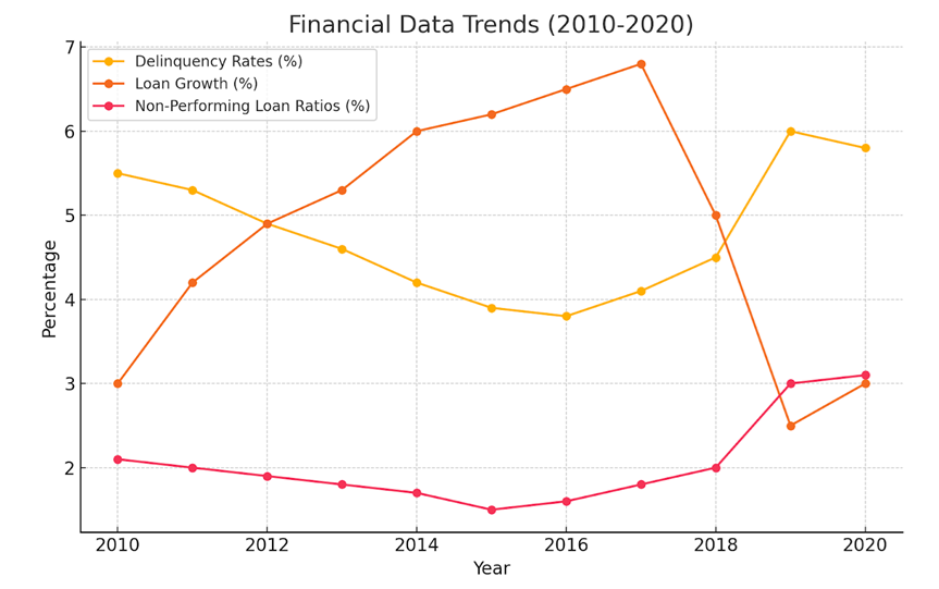 Financial Data Trends: A line chart displaying changes in key credit risk metrics (e.g., delinquency rates, loan growth, non-performing loan ratios) over the past decade, highlighting economic impacts such as the 2008 financial crisis and COVID-19.