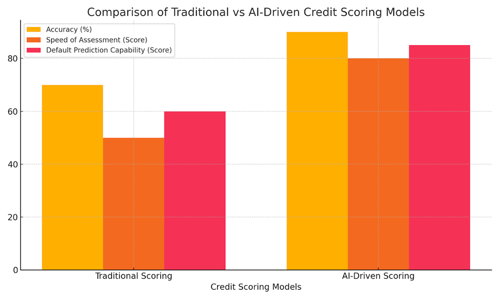 AI Model Comparison: A bar chart comparing traditional credit scoring models with AI-driven models in terms of accuracy, speed of assessment, and default prediction capabilities.